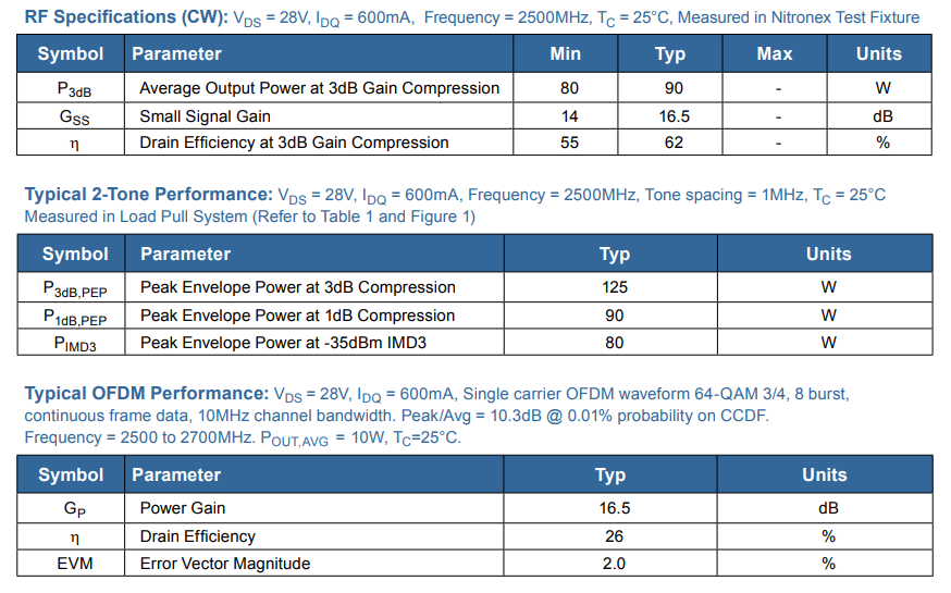 10W線性功率@ 2% EVM單載波OFDM,103dB峰值/AVG,10MHz信道帶寬,16.5dB增益,26%效率