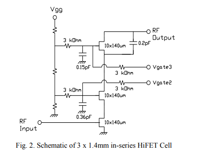 四,3系列1.4毫米HEMT組成。3x1.4mmHIFET裝置是DC和RF的三個1.4mm單位單元。