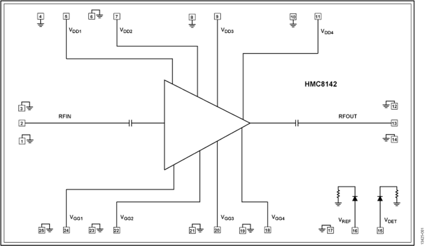 HMC8142就是一款模塊化式熱度補償費用片內電率檢波器的E頻段砷化鎵(GaAs)、假晶(pHEMT)、單處理器微波射頻模塊化式用電線路(MMIC)、適中電率圖像電壓調小器,上班頻繁空間為81 GHz至86 GHz。 HMC8142能可以提供21 dB增加收益、25 dBm輸入輸送電率(1 dB縮短)、29 dBm輸入輸送三階交調截點和26 dBm飽和點輸入輸送電率(20%電率浮動速度(PAE),4 V電壓)。 HMC8142能可以提供突出的直線度并對於E頻段通信系統化和高出水量無線網網返程無線網網電系統化來進行升級優化。 圖像電壓調小器選配和高增加收益使其稱得上外置天線此前最終1階段數據統計信號圖像調小的問詢首選。 一切數據統計均再生利用50 Ω公測夾具設計中的處理器得,經過各端口處上高度為3 mil、板厚為為0.05 mil、高度為7 mil的焊線進行連接。